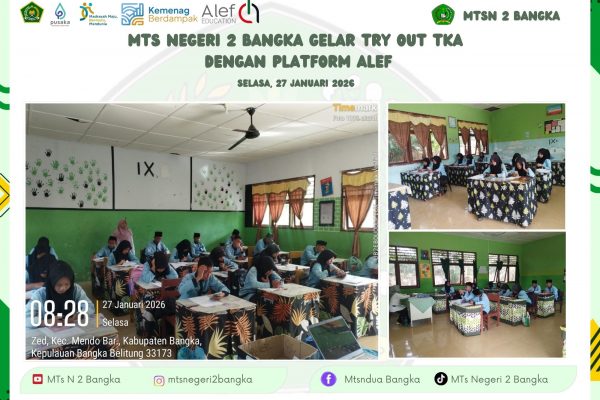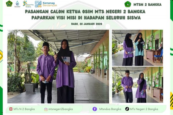 Bangka (Madrasah) – MTs Negeri 2 Bangka melalui Organisasi Siswa Intra Madrasah (OSIM) menggelar kegiatan penyampaian visi dan misi pasangan calon ketua dan wakil ketua OSIM pada Rabu, 28 Januari 2026. Acara berlangsung di halaman madrasah dan disaksikan oleh seluruh siswa. Kegiatan ini menjadi bagian penting dari tahapan demokrasi siswa sebelum pelaksanaan pemilu OSIM yang…