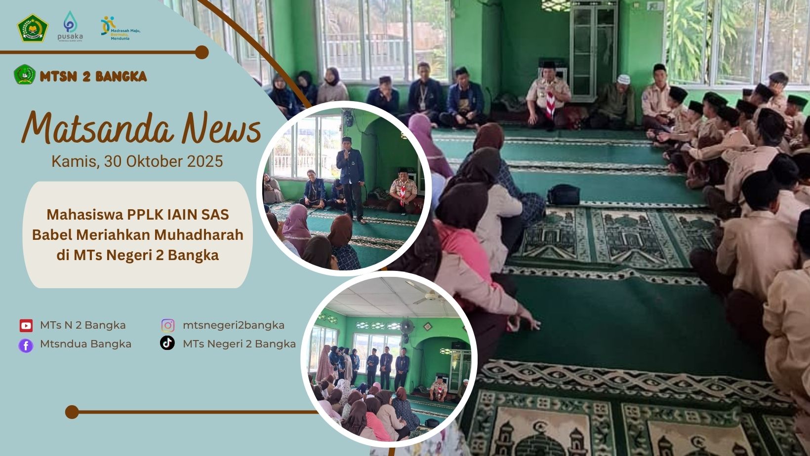 Mendo Barat, Kamis (30/10/2025) — Suasana pagi Kamis di MTs Negeri 2 Bangka terasa berbeda dan penuh semangat. Kegiatan rutin muhadharah kali ini menghadirkan nuansa istimewa dengan kehadiran mahasiswa Program Pengalaman Lapangan Kependidikan (PPLK) dari IAIN Syaikh Abdurrahman Siddik Bangka Belitung sebagai petugas utama.