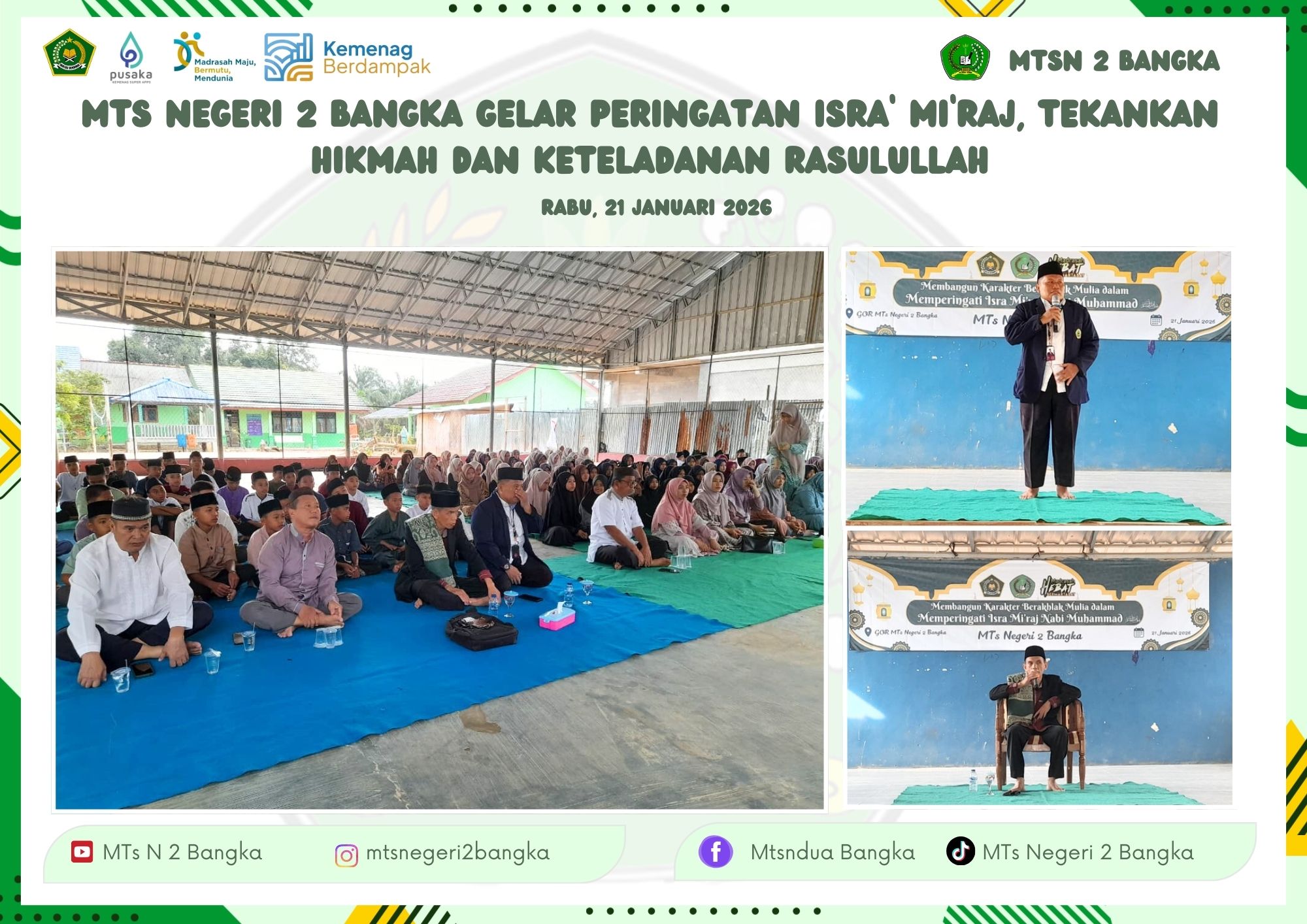 Bangka, Rabu 21 Januari 2025 – MTs Negeri 2 Bangka menyelenggarakan kegiatan Peringatan Isra’ Mi’raj Nabi Muhammad SAW pada Rabu (21/1) bertempat di GOR Madrasah. Acara ini diikuti oleh seluruh siswa, guru, serta pegawai madrasah dengan penuh khidmat dan semangat kebersamaan. Dalam sambutannya, Kepala Madrasah Suprianto, S.Ag., M.A.P. menekankan bahwa peringatan Isra’ Mi’raj tidak boleh hanya menjadi acara seremonial semata, melainkan harus diambil hikmahnya dan diterapkan dalam kehidupan sehari-hari.