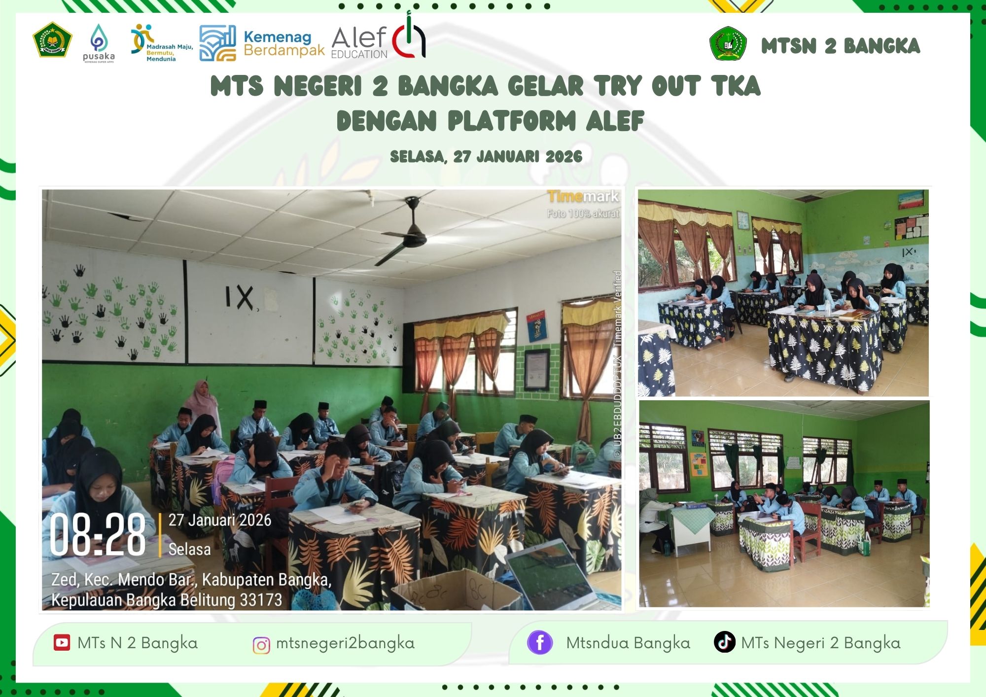 Bangka (Madrasah) – MTs Negeri 2 Bangka menggelar Try Out Tes Kemampuan Akademik (TKA) pada Selasa, 27 Januari 2026. Kegiatan ini diikuti oleh siswa kelas IX A, IX B, dan IX C dengan jumlah total 56 peserta. Try Out berlangsung pukul 08.00 hingga 10.00 WIB dengan mata pelajaran Matematika dan Bahasa Indonesia sebagai fokus utama. Try out ini menjadi bagian dari persiapan siswa menghadapi TKA tingkat SMP/MTs yang dijadwalkan berlangsung secara nasional pada 6–16 April 2026.